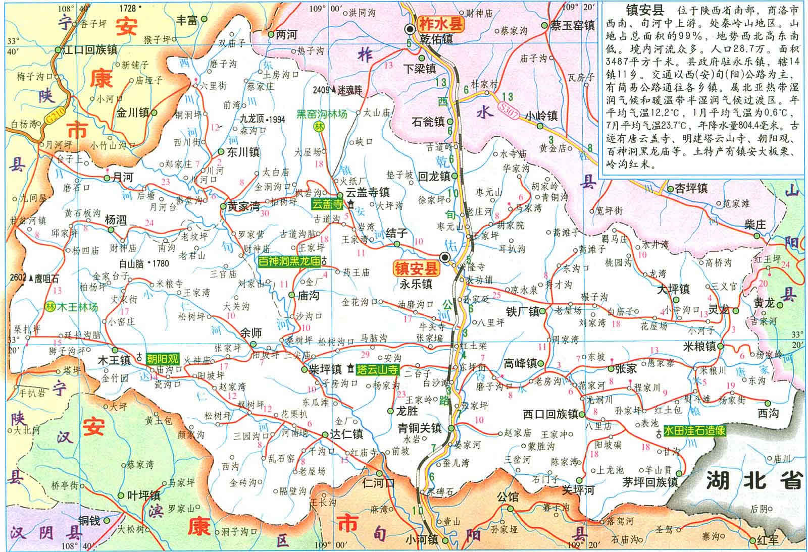 鎮(zhèn)安縣位于秦嶺東段南麓, 位于北緯33.8'至33.48"57',東經(jīng)108 34"35'至109 36"51'。距陜西省西安市195公里,離商洛市178公里。面積3487平方公里?h委、縣政府駐地永樂鎮(zhèn)(謝家彎)縣城前街188號(hào)。境內(nèi)最高點(diǎn)為楊泅鄉(xiāng)鷹嘴石,海撥2601.6米,最低點(diǎn)是龍勝鄉(xiāng)詢河村河谷,海撥344米,高低落差2257.6米,地勢西北向東南傾斜;屬長江水系漢江支流;年均降雨量804.4毫米,年平均氣溫12.2℃,屬亞熱帶半濕潤氣候。