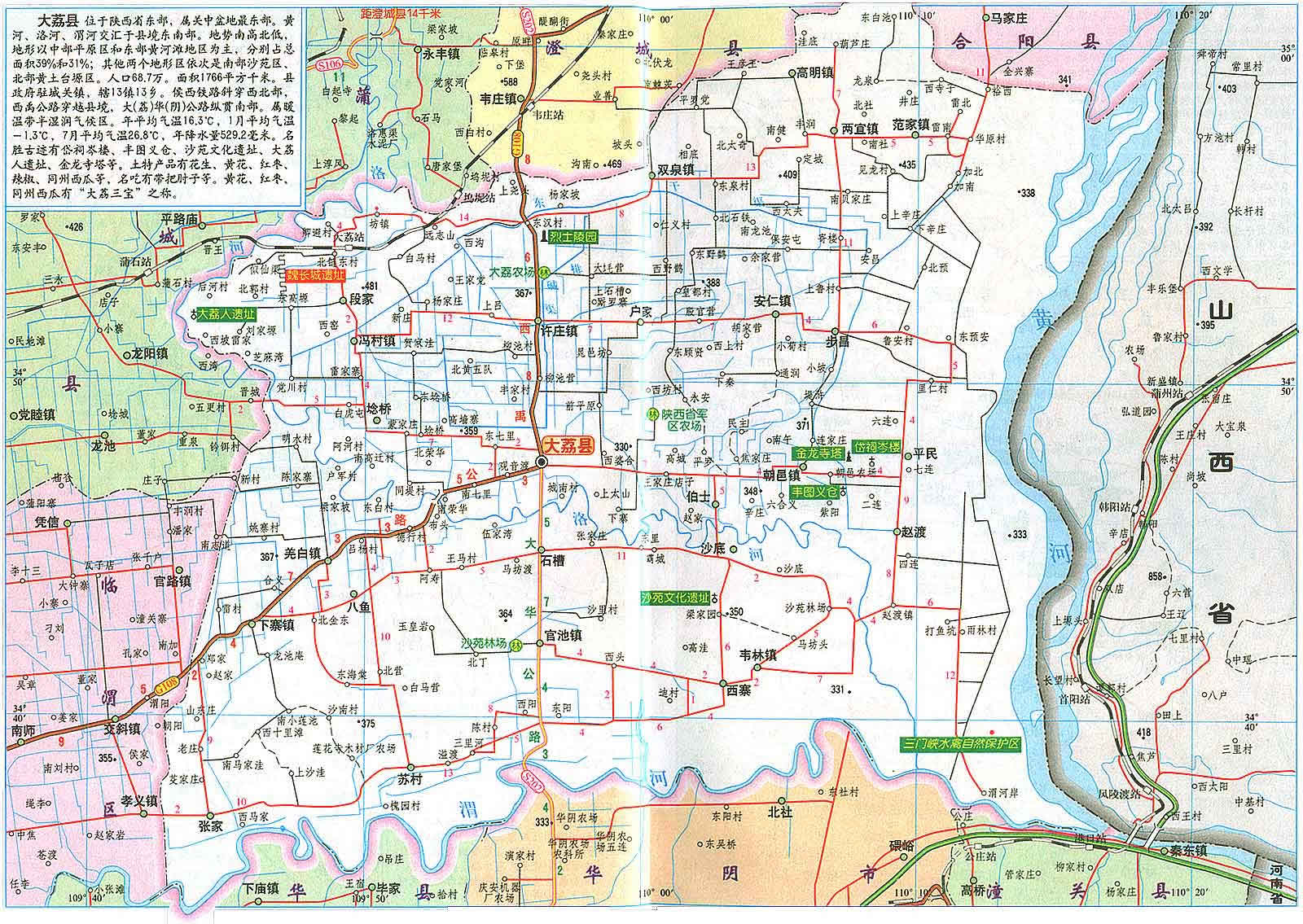 大荔縣位于關(guān)中平原東部,是黃 、洛、渭三河匯流之地。南界渭河與潼關(guān)、華陰、華縣為鄰,西繞洛河與蒲城、臨渭區(qū)毗連,北沿臺塬與澄城、合陽縣接壤,東瀕黃河與山西永濟(jì)相望,素有"三秦通衢"、"三輔重鎮(zhèn)"之稱。大荔縣總面積為1776.1平方公里,全縣轄7鎮(zhèn)26鄉(xiāng),414個(gè)行政村。總?cè)丝?2萬人。