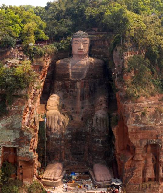 樂山大佛,又名凌云大佛,全稱為“嘉州凌云寺大彌勒石像”,位于四川省樂山市南岷江東岸凌云寺側(cè),瀕大渡河、青衣江和岷江三江匯流處。大佛為彌勒佛坐像,通高71米,是中國最大的一尊摩崖石刻造像。樂山大佛開鑿于唐代開元元年(713年),完成于貞元十九年(803年),歷時約九十年。