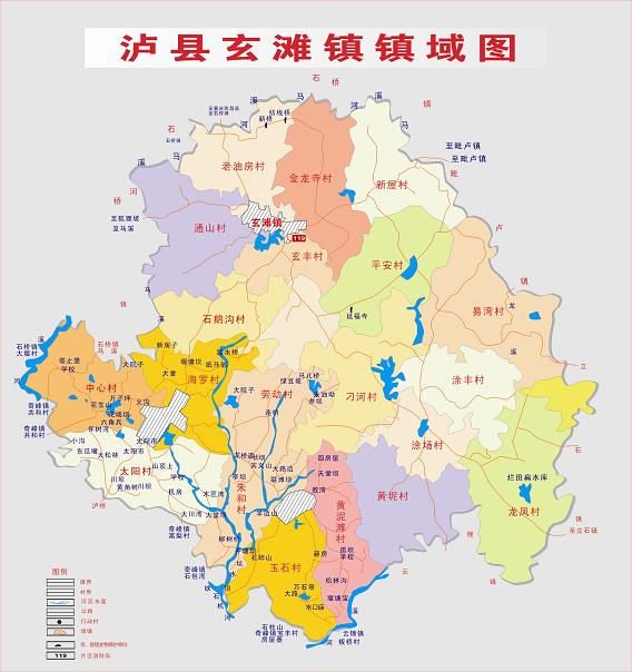 瀘縣玄灘鎮(zhèn)鎮(zhèn)域圖 行政區(qū)劃 瀘縣玄灘鎮(zhèn)幅員面積115平方公里,轄區(qū)內(nèi)人口9萬(wàn)人,城鎮(zhèn)建成區(qū)面積2平方公里,常住人口2.2萬(wàn)人。轄5個(gè)社區(qū)、20個(gè)行政村《正大街社區(qū)、東街社區(qū)、西街社區(qū)、中和社區(qū)、喻坪社區(qū) 》、《石鵝溝村、金龍寺村老油房村、通山村、石鵝溝村、玄豐村、新屋村、平安村、刁河村、黃坭村、涂場(chǎng)村、龍鳳村、涂豐村、易灣村 、太陽(yáng)村、中心村、海羅村、玉石村、黃泥灘村、勞動(dòng)村、朱和村》! 歷史沿革 1934年設(shè)玄灘鎮(zhèn),1937年改鄉(xiāng),1951年復(fù)建鎮(zhèn),1958年改公社,1992年再?gòu)?fù)鎮(zhèn)。1997年,面積74平方千米,人口5.6萬(wàn),轄龍鳳、飛躍、永紅、涂鋒、刁河、馮光、黃泥、同豐、黃林、新山、平安、光前、紅星、向?yàn)、易灣、斷石龍、新屋、蔣灣、金龍寺、新房子、玄鋒、高場(chǎng)、陳家咀、石鵝溝、通山、萬(wàn)居所、桑壩、東風(fēng)、宋糟坊、瓦子壩、清油坊31個(gè)行政村和正大街、馬路街、半邊街、鹽聯(lián)街4個(gè)居委會(huì)。 2004年,面積78平方千米,轄31個(gè)村、4個(gè)社區(qū),總?cè)丝?7621人。集鎮(zhèn)建成區(qū)面積1.7平方千米,常住人口2.15萬(wàn)人。 2006年,將原玉河鎮(zhèn)所屬行政區(qū)域并入玄灘鎮(zhèn)。玄灘鎮(zhèn)政府駐玄灘場(chǎng)。