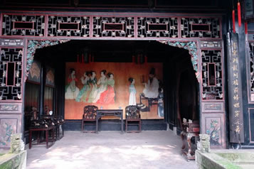 工字廳的正前方有一臺階。臺階上方是戲臺。臺前立柱上有一副對聯(lián):“移影換形儼然君臣父子,假哭真笑表達(dá)離合悲歡”,構(gòu)思精妙,立意深刻,無聲地向人昭示:這里是戲劇的天地。臺口左右華板上雕刻著《白蛇傳》中的“船舟借傘”和《西廂記中》的“鶯鶯聽琴”。人物形神畢現(xiàn),栩栩如生。臺前的落地罩精致絕倫,有關(guān)專家學(xué)者稱贊其“集中國民間傳統(tǒng)木雕之精華”,自是當(dāng)之無愧,其雕刻內(nèi)容,有歷史故事,如“黃道州發(fā)兵抗清”;有戲劇故事,如“別窯從軍”;有的取材于唐詩,如“尋隱者不遇”、“清明詩”等,有民間傳說,如“羊有跪乳之恩、烏有反哺之義”;有的采用諧音、象征手法表現(xiàn)美好的意愿的傳統(tǒng)圖案,如“掛印封候”、“富貴白頭”、“路路通順”等。