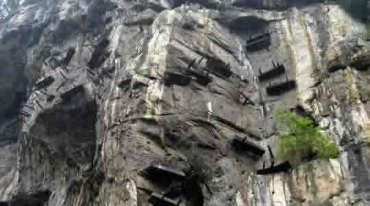 珙縣洛表麻塘壩和蘇麻灣是僰人懸棺最集中的地方,僅在縱深四千米長的麻塘壩懸崖絕壁上,現(xiàn)存上萬個(gè)棺樁棺孔;數(shù)百具懸棺,是世界上懸棺分布最集中,保存最完好,數(shù)量最多的地區(qū),被譽(yù)為“世界一絕”、“天然懸棺葬的博物館”。其悠久的歷史,神奇的傳說,神秘的文化,獨(dú)特的葬式,耐人尋味,千古難解。同時(shí),隨棺而作的數(shù)百幅巖畫,色彩鮮艷,栩栩如生;形象地再現(xiàn)了僰人時(shí)代的自然環(huán)境、社會(huì)生產(chǎn)、民風(fēng)民俗、宗教信仰,令人折服。入口處的“九盞燈”,因傳說三根橫木上共放有九盞“長命燈”而得名,它前有點(diǎn)將臺(tái);右有石船。形如斧砍的石灰?guī)r絕壁上,分布了二十四具懸棺、六十二幅巖畫。懸棺神奇絕妙,府瞰萬眾;巖畫題材廣泛,內(nèi)容豐富,牽馬放牧,垂鉤釣魚、舞蹈、球戲、踢鍵娛樂。雖然構(gòu)圖簡練,線條粗獷,卻富有濃郁的生活氣息和鮮明的民族風(fēng)格。而最遠(yuǎn),最高的當(dāng)數(shù)老鷹巖;14具懸棺懸置在110余米的峭壁上,為懸棺精華。而蘇麻灣山勢巍峨;奇巖崢嶸,河水澄澈清瑩,山光水色相映成趣,優(yōu)美迷人,在距水面50余米的懸崖峭壁上重重疊疊的放有50具懸棺,并留有大量樁孔,給人以奇異神秘的感受。另外,麻塘壩謝家灣,留有一民國建筑一何家大院,已有180多年的歷史,占地15畝,全為木質(zhì)結(jié)構(gòu),有三座院落,一個(gè)花園,二座石碉樓;雕刻精美,巧妙絕倫。