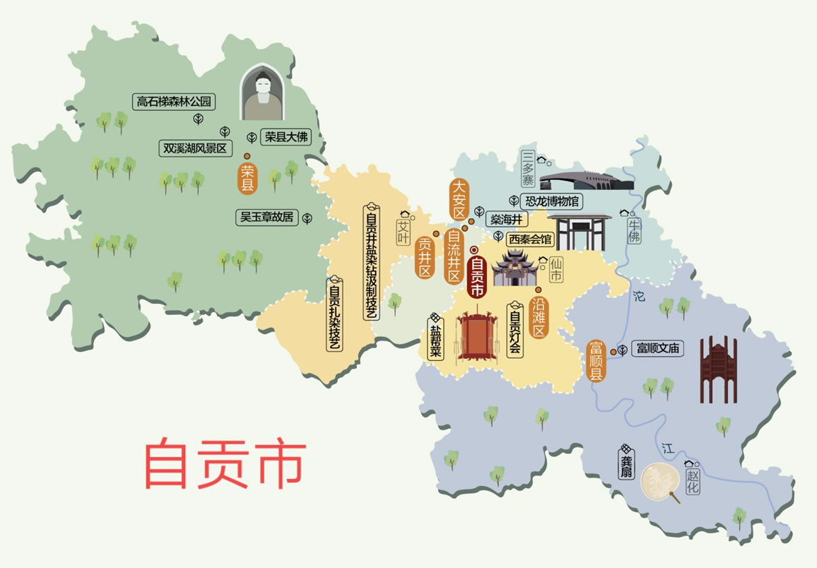 自貢市轄4個區(qū)、2個縣:
