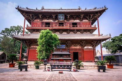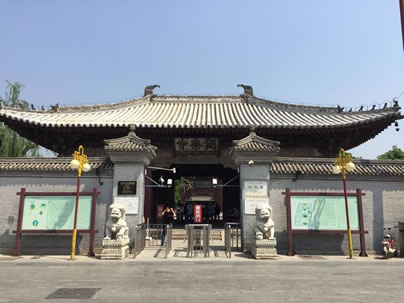獨(dú)樂寺山門是我國現(xiàn)存最早的廡殿頂山門,山門面闊三間,進(jìn)深兩間,中間做穿堂,正脊兩端的鴟吻,造型生動(dòng)古樸為,遼代原物。