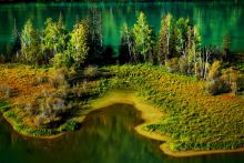 變色湖位于喀納斯湖中央。春夏時(shí)節(jié),湖水會(huì)隨著季節(jié)和天氣的變化而變換顏色。從每年的四五月間開(kāi)化到11月冰雪封湖,湖水在不同的季節(jié)呈現(xiàn)出不同的色彩。5月的湖水,冰雪消融,湖水幽暗,呈青灰色;到了6月,湖水隨周山的植物泛綠,呈淺綠或碧藍(lán)色;7月以后為洪水期,上游白湖的白色湖水大量補(bǔ)給,由碧綠色變成微帶藍(lán)綠的乳白色;到了8月湖水受降雨的影響,呈現(xiàn)出墨綠色;進(jìn)入9、10月,湖水的補(bǔ)給明顯減少,周?chē)闹参锷拾邤,一池翡翠色的湖水光彩奪目。