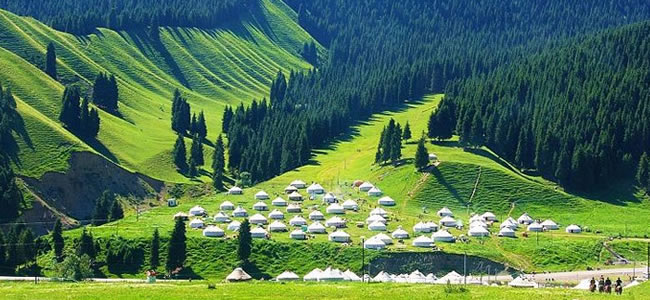 南山西白楊溝位于烏魯木齊南郊,距市區(qū)75千米,屬北天山的喀拉烏成山北麓,地處中山與低山過渡帶,海拔2252公尺,年降雨量500-600毫米。溝谷最里邊有一天然絕壁,其上,一條落差40余,寬約2米的飛瀑如白練飄舞,急瀉而下。草坡上有南山風(fēng)景管理處開辦的氈房招待所,坡下有餐廳,可滿足游人食宿需要。