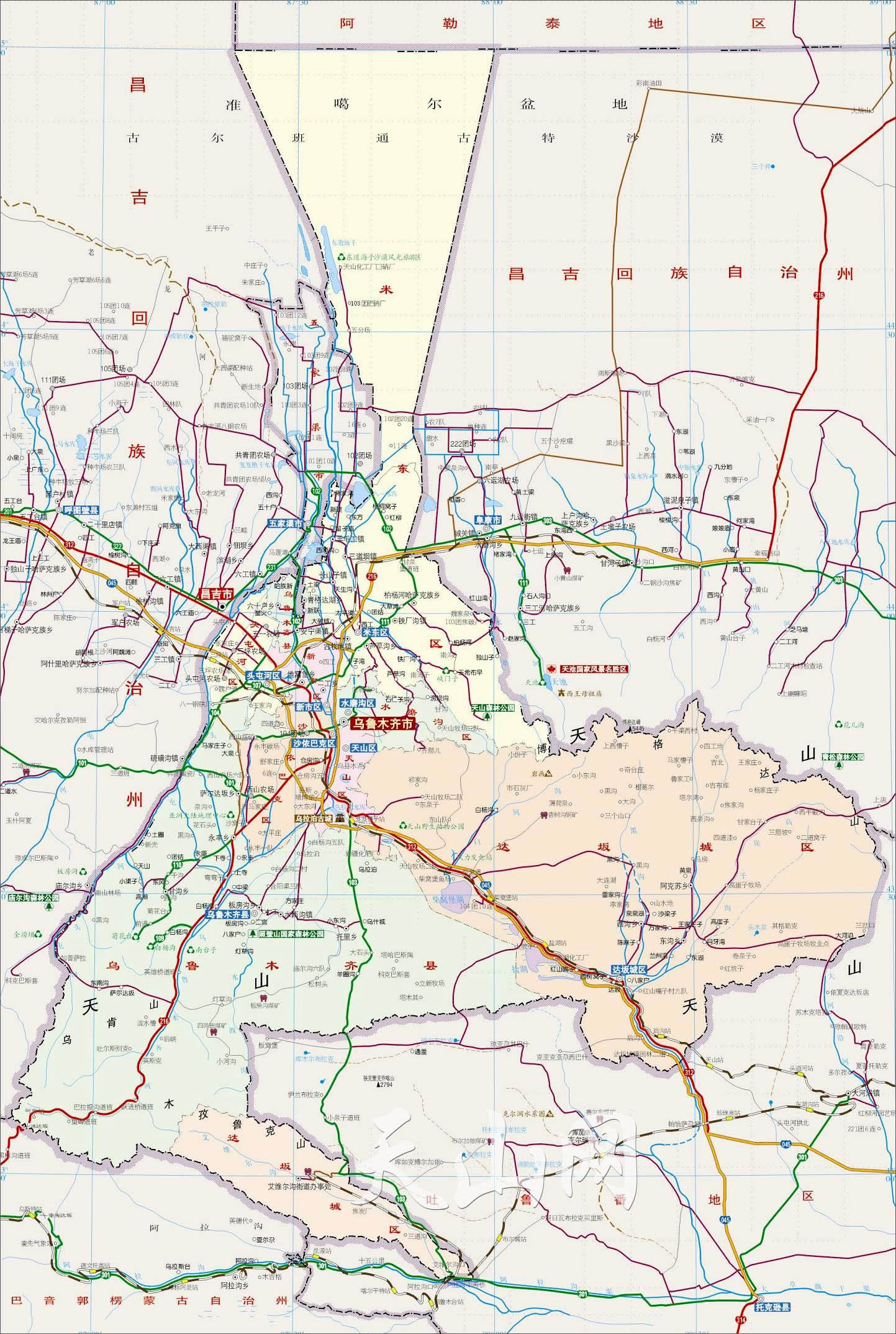 烏魯木齊縣 面積4211平方千米,人口52406,政府駐南華路99號,下轄2個街道、3個鎮(zhèn)、3個鄉(xiāng)