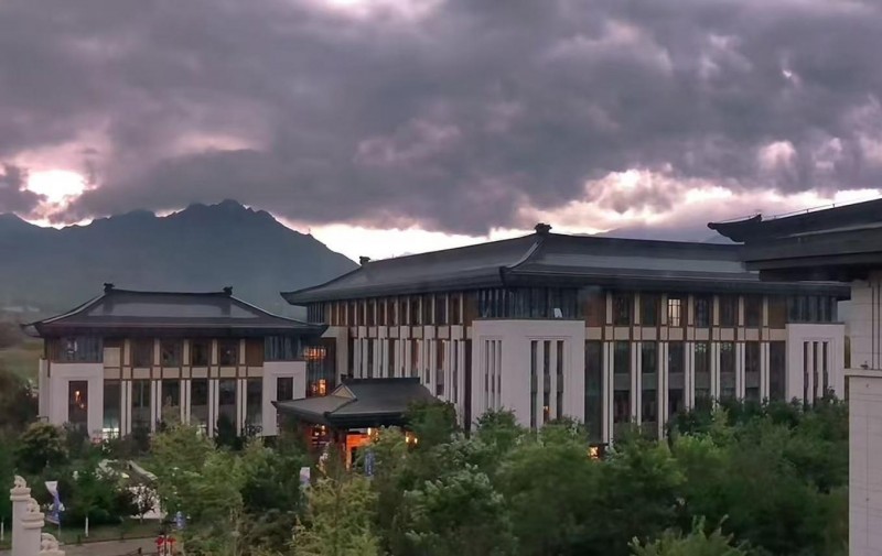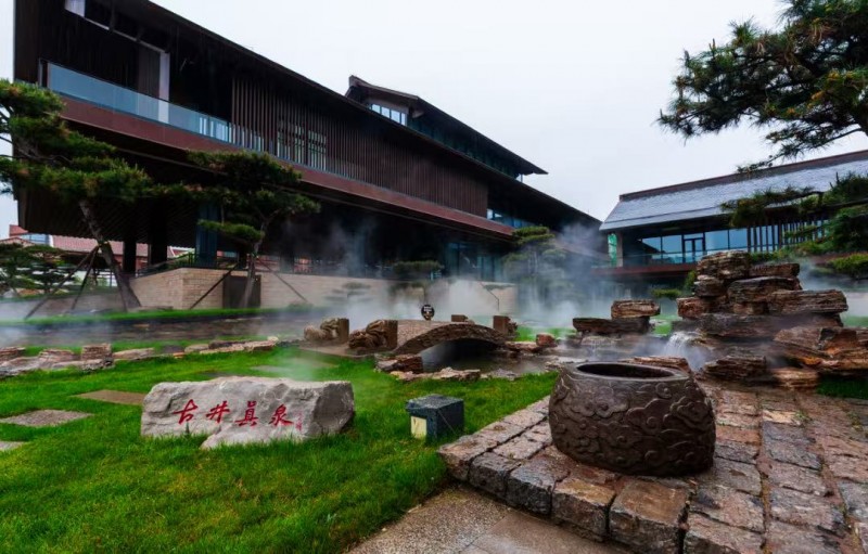 那白,不再是日光下格外耀眼的白,而是閃著被雨水調(diào)和了的,一種溫潤如玉的光澤;那瓦,也不再是樸素的灰,而是透著水光,泛著烏亮的顏色,像巨鳥收斂的羽翼,沉靜地棲息著。松風館靜默在青松的環(huán)抱里,雨水順著松針的尖端,凝成一顆顆晶瑩的,欲墜未墜的珠子。遠遠望去,太行山原本雄渾蒼勁的輪廓,在雨幕里漸漸化作宣紙上暈開的青黛,而繚繞的云霧,恰似畫家筆下有意無意的留白。此刻,唯有雨水從高處滴落,敲在石上、葉上的聲響,正應(yīng)了那句“青松凝露翠,寒色隱泉聲”的幽靜與禪意。