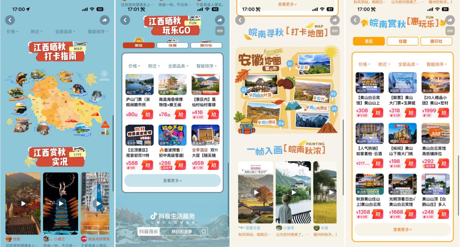 抖音深度響應(yīng)用戶對(duì)季節(jié)限定體驗(yàn)的需求,以“秋日儀式感”為切入點(diǎn),聯(lián)動(dòng)江西和安徽多城自然人文類商家,分別發(fā)起#來江西曬個(gè)秋 與#賞皖南秋意濃 話題活動(dòng),累計(jì)收獲話題總播放量2945萬,用戶投稿4275條,相關(guān)搜索UV突破406萬,同比增長(zhǎng)19%。從江西婺源的篁嶺景區(qū)到安徽黃山的三塔景區(qū),從葛仙村的千燈夜游到三清山的云海勝景,抖音平臺(tái)的內(nèi)容生態(tài)與交易場(chǎng)景實(shí)現(xiàn)深度融合,推動(dòng)江西與安徽兩地文旅目的地整體支付達(dá)GMV2.22億元,同比增長(zhǎng)246%,讓從發(fā)現(xiàn)出行靈感至完成目的地消費(fèi)的全過程更加順暢自然。