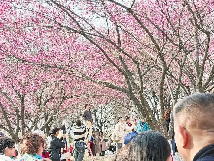 雖是工作日午后,坡上已有數(shù)百位市民游客漫步賞玩。花影人潮中,除了專(zhuān)程而來(lái)的攝影愛(ài)好者架起“長(zhǎng)槍短炮”,更有許多家庭扶老攜幼,在梅林間游玩、野餐。曾是約拍行業(yè)淡季的隆冬時(shí)節(jié),也成了旺季。“花期比往年早了近一個(gè)月,好幾個(gè)周末的‘約拍’都排滿(mǎn)了。”攝影愛(ài)好者周女士邊調(diào)整鏡頭邊說(shuō)。據(jù)攝影師“四葉草”介紹,周末這里人流如織,即便今天是工作日,前來(lái)拍照的游客依然不少。“目前‘梅花坡’花開(kāi)得最盛,大家都搶著來(lái)出片,競(jìng)爭(zhēng)壓力不小。眼下的梅花是開(kāi)年第一波熱度。”