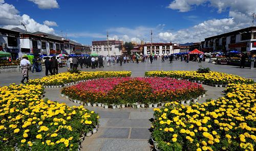 底層售票處,有樓梯可以直通二樓和三樓的平臺。在平臺上遠(yuǎn)眺:布達(dá)拉宮的建筑在耀眼的陽光中光芒四射。俯視可以看到大昭寺廣場人流潺動,可盡覽充滿藏族生活氣息的八廓街。夏天這里還有茶座,在此可以休息。