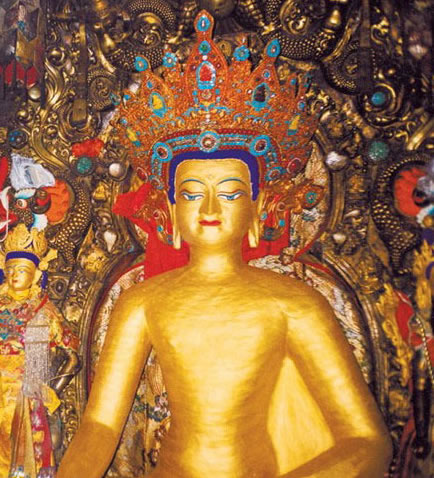 酥油燈后是大昭寺主殿正門,大昭寺最早的建筑都從正門開始;外院是后來修建、擴(kuò)充的,而主殿是1400多年前的建筑。由于多年信徒的摩擦,門口的石頭地板光亮如鏡。大殿左右各有一尊巨大的佛像。左側(cè)為紅教創(chuàng)始人密宗大師蓮花生,他本來是印度的佛學(xué)家,公元八世紀(jì)進(jìn)藏,在他入藏以后藏區(qū)開始出現(xiàn)密宗。右側(cè)是未來佛。