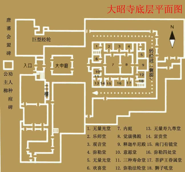 從大昭寺金頂可以看到大昭寺廣場,右邊遠(yuǎn)處山上是布達(dá)拉宮,近處的柳樹是“公主柳”,相傳是文成公主所栽。大昭寺的布局方位與漢地佛教的寺院不同,其主殿是坐東面西的。主殿高四層,兩側(cè)列有配殿,布局結(jié)構(gòu)上再現(xiàn)了佛教中曼陀羅壇城的宇宙理想模式。寺院內(nèi)的佛殿主要有釋迦牟尼殿、宗喀巴大師殿、松贊干布殿、班旦拉姆殿(格魯派的護(hù)法神)、神羊熱姆杰姆殿、藏王殿等等。寺內(nèi)擁有各種木雕、壁畫。