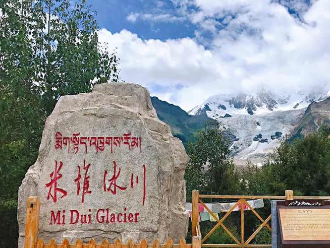 米堆冰川位于波密縣玉普鄉(xiāng)境內(nèi),距縣城103公里,離318國道8公里,最近的村莊離此地僅有2公里,是西藏最重要的海洋性冰川。冰川主峰海拔6800米,雪線海拔只有4600米,常年雪光閃耀、景色神奇迷人。冰川冰潔如玉,景色秀美,形態(tài)各異,姿色醉人。冰川下端是針闊葉混交林地,皚皚白雪終年不化,郁郁森林四季常青,頭裹銀帕,下著翠裙。由于冰面氣溫較暖,常年生活著冰蚯蚓、冰蚤和其他各類微生物。受喜瑪拉雅山東段的氣候影響,米堆冰川雖位于北緯29°的位置,但是冰川末端的溫度卻比大約北緯44°的博格多山的冰川還要低,是我國現(xiàn)代冰川中較為特殊的現(xiàn)象。