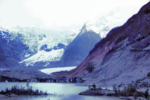 離開川藏公路,過了新建的橫跨額公藏布江公路橋后,只見一條兩面均是懸崖絕壁的峽谷,沿著小河修建的村道僅能通過一輛車,再走幾公里后,突然出現(xiàn)大片寬闊的谷地,遠(yuǎn)處兩條壯觀的冰瀑布掛在雪峰與森林之間,猶如兩道由天而下的巨大銀幕……要與米堆冰川做近距離接觸的話,還要徒步走進(jìn)層林盡染的森林,翻越三道冰川運動留下的終磧垅。當(dāng)走上第三個終磧垅時,一個冰湖出現(xiàn)。冰湖的另一端有一道寬近兩米、高達(dá)十?dāng)?shù)米的斷裂的冰舌,發(fā)出幽幽的藍(lán)光。從天而下的冰瀑布在陽光下閃著銀色的光芒,近800米的落差讓人感到一陣暈眩。一陣陣從冰川上吹來的寒風(fēng)迎臉撲來,在強(qiáng)烈的陽光下,還是讓人不寒而栗。