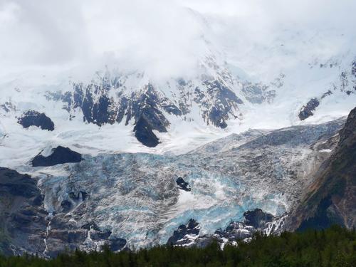 該冰川常年雪光閃耀,景色神奇迷人。這是典型的現(xiàn)代季風(fēng)型溫性冰川,類型齊全,尤以巨大的冰盆、眾多雪崩、陡峭巨大700-800米的冰瀑布、消融區(qū)上游的冰面弧拱構(gòu)造以及冰川末端冰湖和農(nóng)田、村莊共存為特點。
