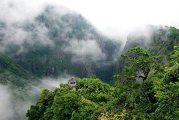 天開石門,是由于一條張性斷裂從山體通過致使其破裂,又經(jīng)流水沿斷裂面不斷侵蝕,加之重力垮塌等原因,形成絕壁對峙,猶如兩扇轟然推開的巨門,因此而得名,被譽為“蒼山之門”。天開石門由兩邊山峰拔地而起,呈V字形隘谷,谷底海拔1760米。北邊的清涼山,最高處海拔2321.8米,北巖壁高561.8米;南邊的翠屏山,最高處海拔2300米,南巖壁高540米。