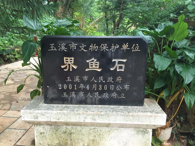 界魚石界魚石屬碳酸鹽巖石礫塊,石塊壁面上有經地質時期溶蝕形成的溶孔。界魚石背靠野牛山,面臨連通星云湖撫仙湖的玉帶河。石塊所在的北岸山坡林木茂密。玉帶河寬70m,水深3-4m,長約2.1km,在界魚石上題刻有“界魚石”,及清江川縣令李密題書“石怪鱗驚”,鐵嶺竺文人兆鵬題書“魚各有性”。