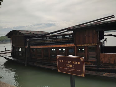 停泊在煙雨樓前水面上的,是1959年仿制的一條當(dāng)年"一大"開(kāi)會(huì)的游船,作為"一大"會(huì)議紀(jì)念船,它向人們生動(dòng)展現(xiàn)了中國(guó)共產(chǎn)黨誕生的歷史場(chǎng)景。這條“一大”紀(jì)念船被人們親切地稱為“南湖紅船”。這是一艘中型的單夾弄絲網(wǎng)船,船長(zhǎng)16米,寬3米。內(nèi)有前艙,中艙,房艙和后艙,右邊有一條夾弄通道,中艙放一張八仙桌,周圍放桌凳和茶幾。當(dāng)年中共“一大”會(huì)議就是在中艙舉行。前艙搭有涼棚,房艙設(shè)有床榻,后艙置有櫥灶等物,船梢系有一條小拖梢船,為當(dāng)時(shí)接人進(jìn)城購(gòu)物所用.。1921年7月23日,中國(guó)共產(chǎn)黨第一次全國(guó)代表大會(huì)在上海秘密召開(kāi)。會(huì)議臨近結(jié)束時(shí),遭法租界巡捕的襲擾而被迫停會(huì),根據(jù)上海代表李達(dá)的夫人王會(huì)悟的建議,8月1日會(huì)議轉(zhuǎn)移到嘉興南湖的一條游船上繼續(xù)舉行。在這條紅船上,會(huì)議通過(guò)了第一個(gè)《中國(guó)共產(chǎn)黨章程》,宣告了中國(guó)共產(chǎn)黨的誕生,從此中國(guó)革命翻開(kāi)了新的一頁(yè)。