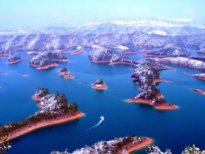 千島湖,是一個美麗的湖 。湖中那1078個島嶼,姿態(tài)各異,風姿綽約。春游湖上,布滿山花的島嶼,是一個個天真爛漫的村姑;夏日游湖,人們多想在這碧波中逐浪暢游;秋山紅葉,使人想起"霜葉紅于二月花"的詩句,雪滿湖山,松挺山崖,又是一幅王維筆下的詩畫圖。