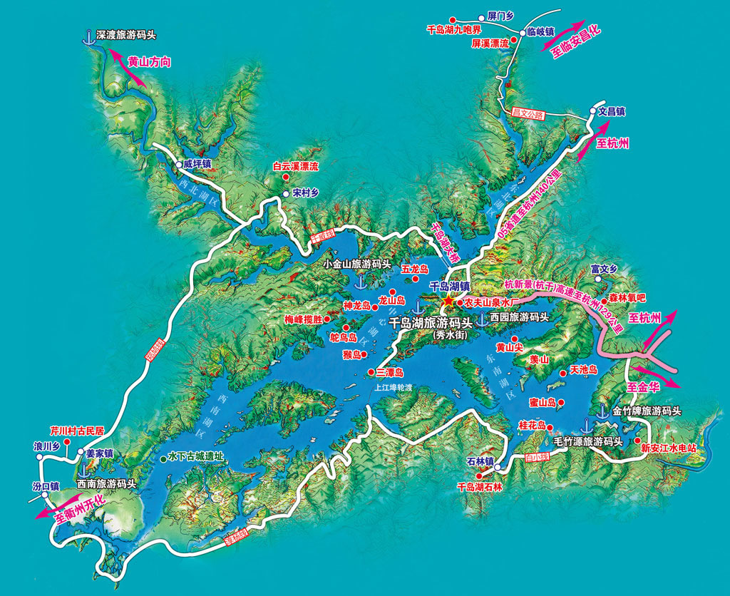 千島湖與桐廬瑤林仙境、嚴子陵釣臺,建德大慈巖,蘭溪諸葛八卦村,龍游石窟,安徽西遞、宏村等景點聯成一體,體,吸引眾多的游客。千島湖所在的淳安縣北接臨安縣、南接常山縣、西南與開化縣、衢州市為鄰,東南與桐廬和建德二縣市接壤,西北與安徽省交界。