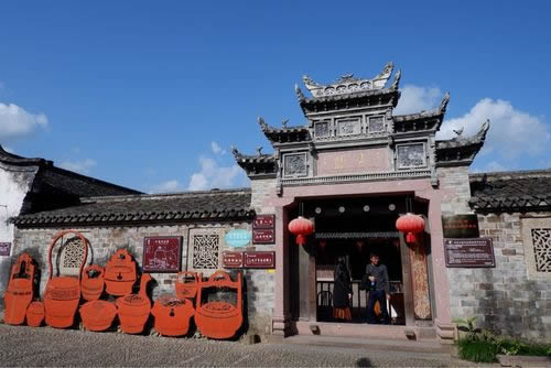 老街兩旁都是長板門面的店鋪。緊鄰老街是一幢幢至今保存完整的古建筑群,梁枋門窗上滿是雕飾,精巧的躍魚馬頭墻和脊塑墻花具有獨特的地方風(fēng)格。馬頭墻是古代江南富戶官宅威勢的象征,據(jù)說級數(shù)越多,職位越高。墻面嵌著雕花石窗,外墻上塑浮雕文字,墻尖塑著沖天而起的躍魚和飛龍,寓含“鯉魚跳龍門”之意。門柱上那兩只活動的倒掛獅子,門墻上一對瓷盆中各飾有5只飛舞的蝙蝠,象征著五福臨門。大祠堂建于明洪武十八年。大廳有32根大圓柱,好比32顆象棋子,隱含全局一盤棋之意;每根柱子中間大,兩頭小,是典型的隋唐風(fēng)格明式建筑。