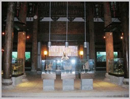 向右進(jìn)一小門(mén)是一小展廳,展示的是諸葛村村民中收集來(lái)的一些原諸葛族人在外經(jīng)營(yíng)藥業(yè)時(shí)保存下來(lái)的藥用器具,有明代的石藥碾、藥壇,有清代的藥碗、錢(qián)稱、藥匙、藥壺,還有百年老店“天一堂”清代期間制售的 “諸葛行軍散”、“臥龍丹”、“眼藥膏”!疤煲惶谩、“保仁堂”的藥店印章。