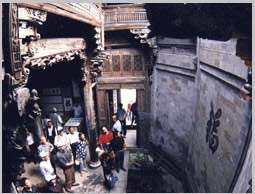 鐘池四周伸展出八條小巷,特點(diǎn)各個(gè)不同,形成了坎、艮、震、巽、離、坤、兌、乾八個(gè)部位。大公堂就在它的坎宮部位,從它的正門(mén)邊上東而去的一條十分幽深,一層層的臺(tái)階上坡,左側(cè)是綠蔭如蓋的園子,的一右側(cè)是一排排住宅的后墻,這條巷是通往村中十八廳堂之一的積慶堂的。鐘池東面條巷子很平直,100米長(zhǎng)。八條小巷似通卻閉,似連卻斷,虛虛實(shí)實(shí),猶如一張蜘蛛網(wǎng),又宛如一座迷宮。